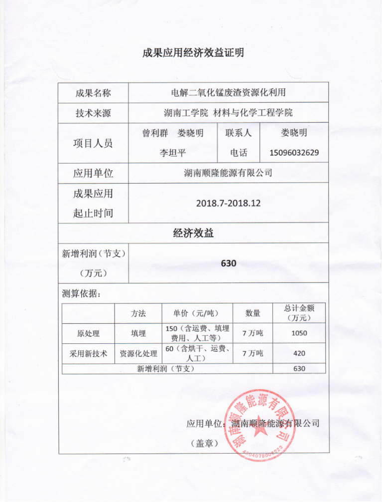 “电解二氧化锰废渣资源化利用”成果在湖南顺隆能源有限公司产生的经济效益证明材料