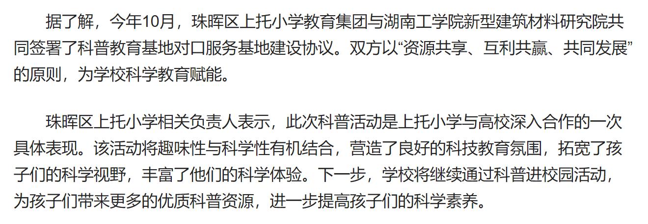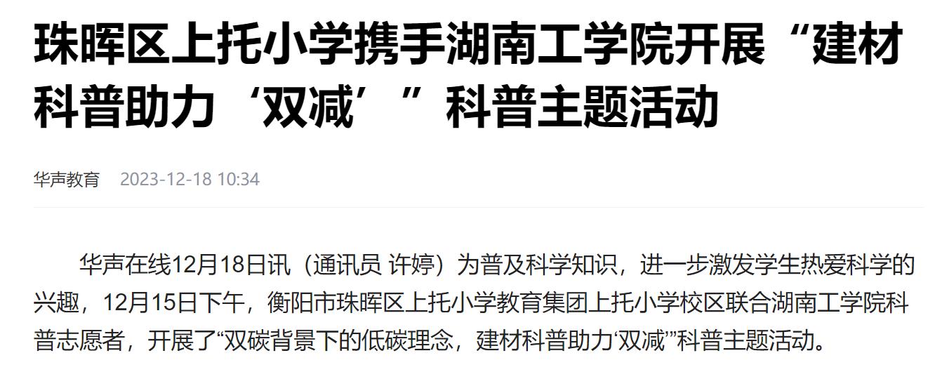 华声在线:珠晖区上托小学携手best365唯一官方网站开展“建材科普助力‘双减’”科普主题活动