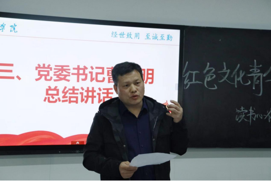 曹文明总结讲话。他指出,读书心得活动很有意义,同学们应该聚焦经典著作,不仅要读语言、读审美,更要在研读过程中发展自己的思维,完善自我。他对同学们提出了三点要求:一、要从红色资源中汲取真理和信仰力量。把红色资源作为坚定理想信念,加强党性修养的生动教材,从中汲取成长的智慧、激发拼搏的力量。二、要从红色文化中感悟初心使命。用心用情讲好党的故事,使红色基因渗进血液、浸入心扉。三、要从红色理论中永葆革命本色。始终做中国特色社会主义的坚定信仰者、忠实者、实践者,争做新时代的奋斗者,幸福生活的创造者。