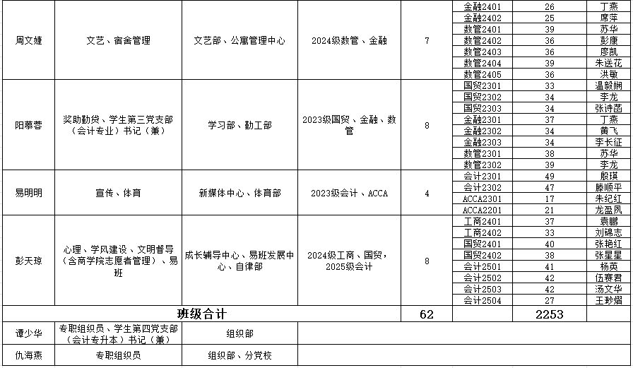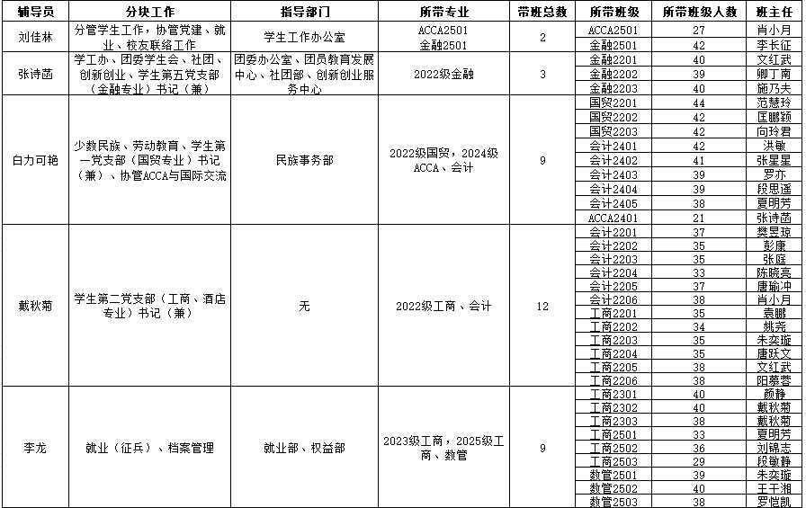 商学院学生工作人员分工、带班情况及班主任一览表(2026年3月)