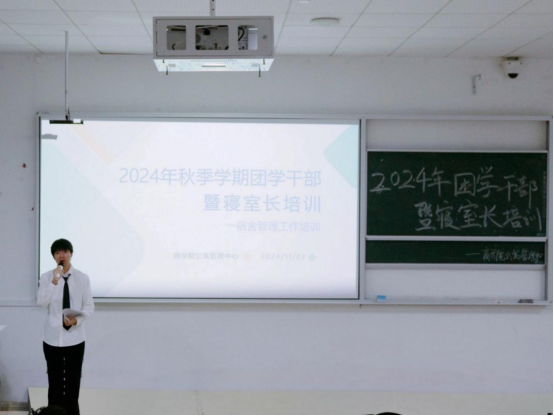 为落实学校宿舍管理制度,维护寝室的基本原则规定,提高我院整体宿舍文明程度。11月7日晚,商学院于经管楼601成功开展2024年秋季学期团学干部暨寝室长培训。学工办副主任白力可艳、辅导员曾子瑶、主要团学干部及2024级新生和专升本新生寝室长参加本次培训。