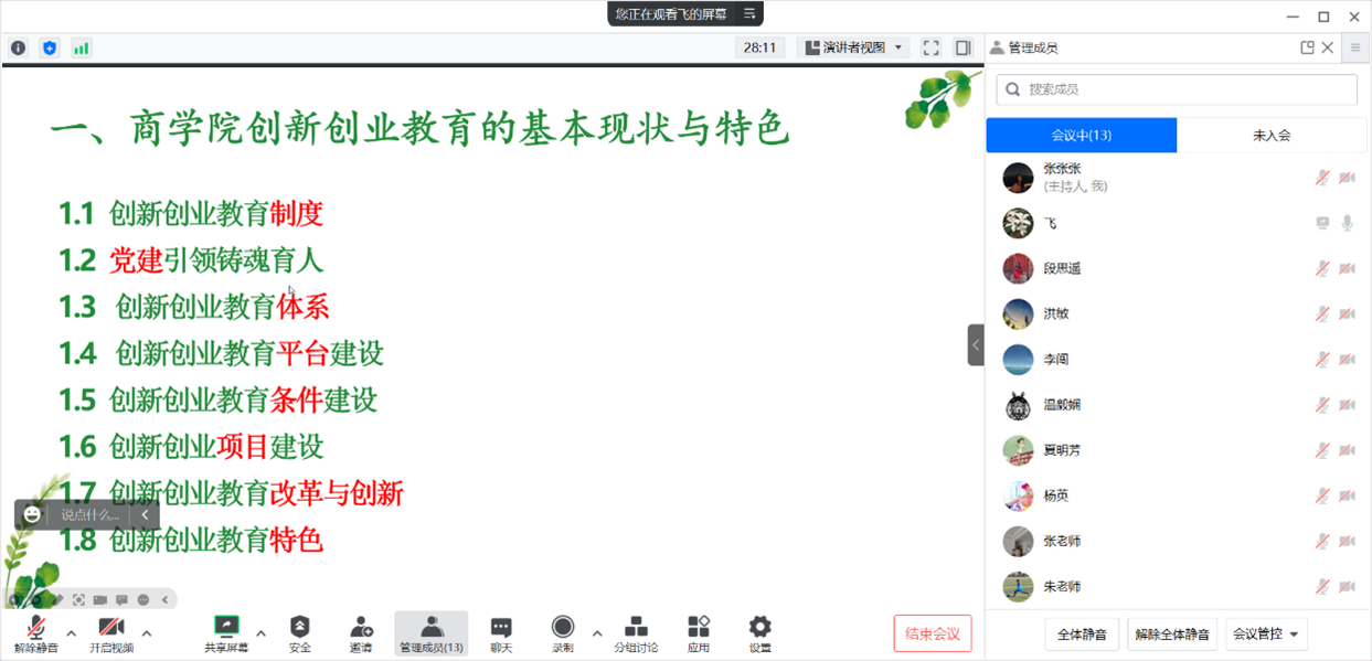 副院长黄飞汇报了学院创新创业教育的基本现状与特色,他从制度、体系、平台、改革与创新等八个方面进行了详细的分析。他指出,商学院创新创业教育在党建引领下,体系逐步完善,过程逐步规范,条件逐步成熟,成效逐步显著,增强了学生的实践创新能力,体现了应用型人才培养目标。同时,他也分析了目前学院创新创业教育存在的问题,明确了下一步计划与想法,希望学院的创新创业教育发展更上一个台阶。