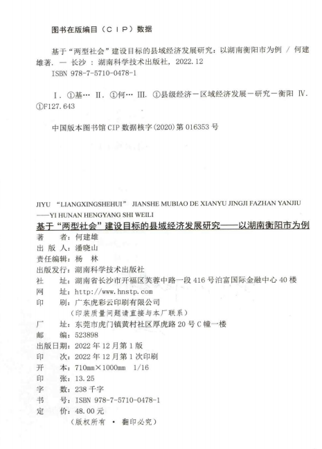 本专著基于经济高质量发展视角,以湖南省衡阳市为例对县域经济和环境协调发展问题进行实证研究。在充分吸收前人研究成果的基础上创新性地提出经济发展度、社会公平度、环境协调度等三大指标体系,在对湖南省衡阳市县域经济发展存在的问题进行总结的基础上,通过对衡阳市5县2县级市的县域经济发展基本特点的研究,为湖南省衡阳市县域经济未来发展模式转变提供了路径选择和对策建议,开出县域经济发展的工业化、城镇化、产业化和民营化等“四化”宏观发展药方,并从改革农业生产方式、创新生产手段、调整生产过程等方面提出中观手段,从推进农业结构调整、加速农村城镇化进程、坚定走新型工业化道路和壮大县域民营经济等方面提出基本路径,对促进衡阳市“两型社会”县域经济协调发展,进而推动湖南县域经济乃至整个中部地区的国民经济发展意义重大。