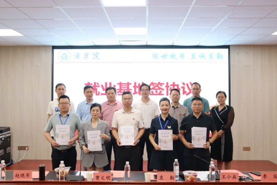 全体与会领导为校友们颁发创业导师聘书,深圳陈列共和设计有限公司、湖南良才联合会计师事务所等6家校友企业共同与学院签署就业基地合作协议。