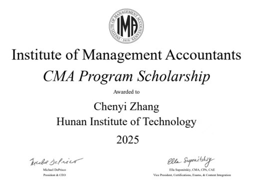 2025年3月,通过层层选拔,我院霍成萍、颜丽阳、张晨依3位同学荣获IMA中国CMA奖学金,CMA奖学金等值金额约6000元人民币。