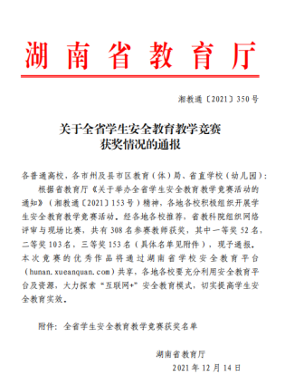 近日,湖南省教育厅公布了2021年湖南省学生安全教育教学竞赛结果,best365官网教师王津津在欧丽娟教授的指导下的作品《化学品安全》经专家网络评审和现场比赛,在来自全省各级各类学校近500名教师参赛中荣获三等奖。(教学质量监控与评估中心 周斌)