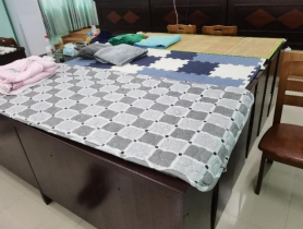 为不给杨柳村村民添麻烦,不给村民生活造成不便和困扰,实践团成员坚决要求住在杨柳村综合服务中心的会议室。没有床铺,大家就将会议桌组合在一起形成临时床铺,然后铺上自带凉席进行休息,有的队员甚至干脆将凉席直接铺在地上席地而睡。尽管住宿条件简陋,生活环境较为艰苦,特别是夜晚蚊虫甚多,但是队员们没有一个因此抱怨,个个能坚强面对,没有一个人叫苦说累,而是将吃苦受累当成是对青春的最好磨炼与馈赠。