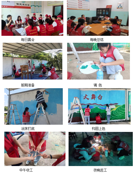 自6月25日直至27日中午,实践团成员不惧烈日骄阳,在指导老师的悉心指导下,严格按照活动方案的任务分工与实施步骤,日夜赶工。每天早上召开成员碰头会后,实践团成员便奔赴工作现场,积极投入自身工作,有的准备画材、调色,有的构图起形、勾线上色。大家各负其责,团结协作,用智慧和创意的双手精心装点杨柳村大舞台。