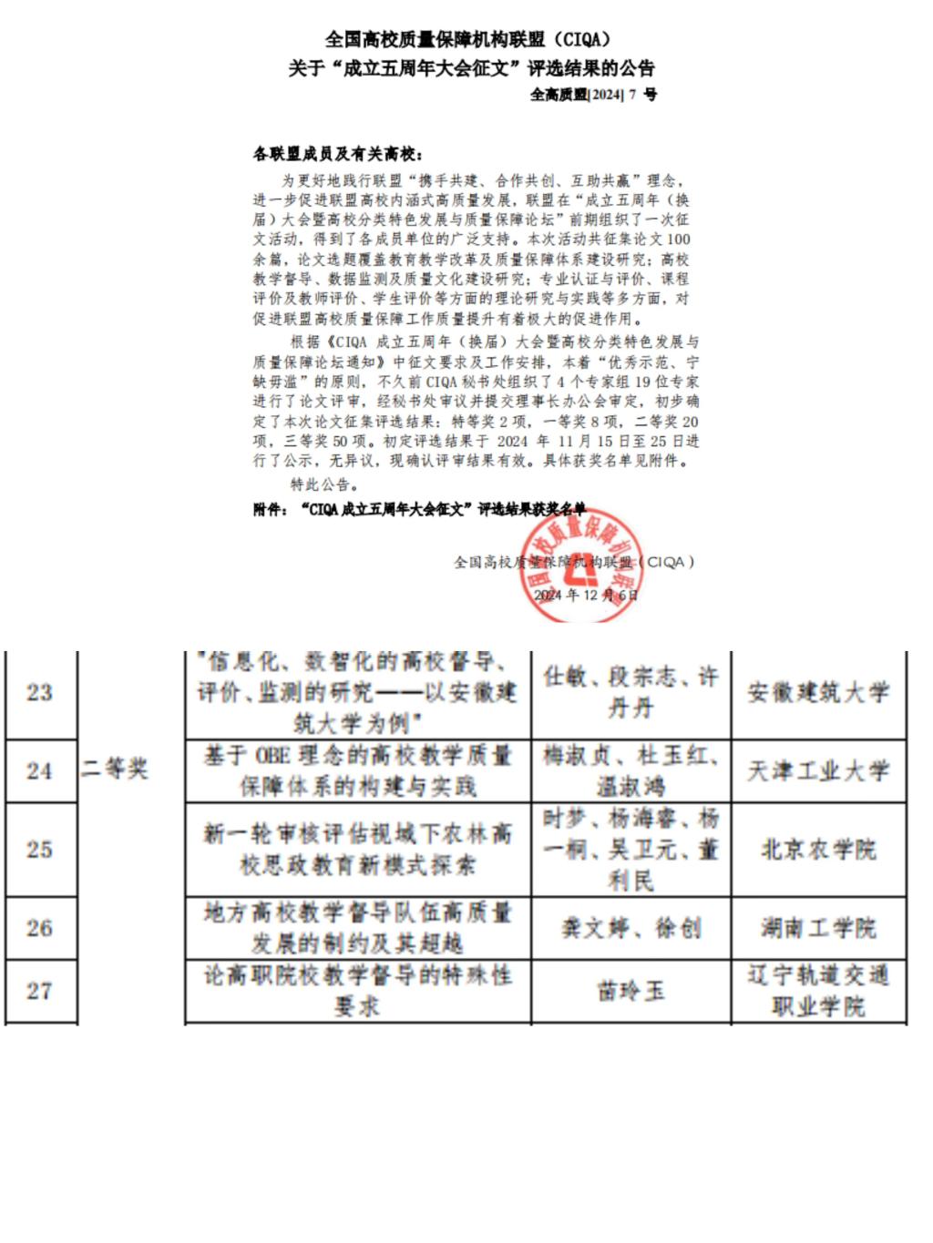 12月5日至7日,2024全国高校质量保障机构联盟(CIQA)年会暨高校质量保障体系建设现状与展望论坛在泉州举办,主题为“从现状到未来:高校质量保障体系创新实践与未来展望”。best365官网作为副理事长单位参会并获佳绩。