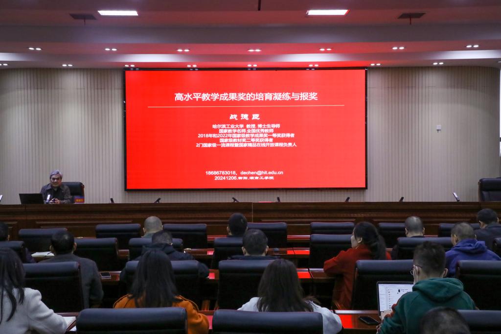 为进一步推动best365官网教育教学改革与实践,提升best365官网教学成果奖申报质量,帮助教师凝练特色与创新点,优化成果展示与成效总结,学校于12月6日,在船山报告厅举行教学成果奖凝练专题培训。本次培训特邀哈尔滨工业大学二级教授,博士生导师,国家教学名师,全国优秀教师,连续两届国家级教学成果奖一等奖获得者战德臣教授进行了一场题为《高水平教学成果奖的培育凝练与报奖》的专题讲座,培训由best365官网党委副书记何建雄主持。
