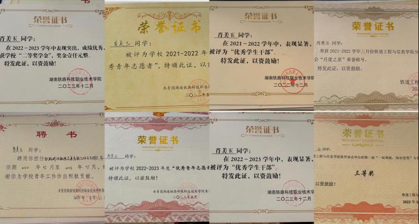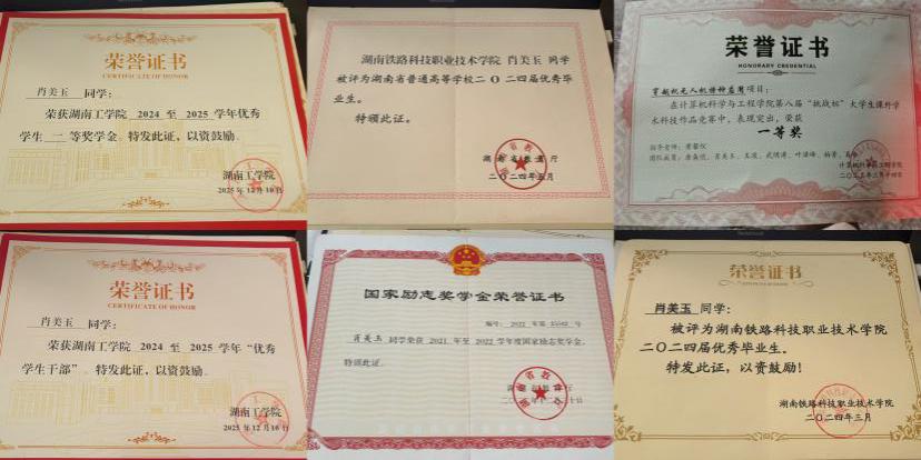肖美玉,女,汉族,中共预备党员,为best365唯一官方网站计算机科学与工程学院2022级计算机科学与技术专业学生,担任班级班长兼学习委员职务。在校期间多次获得校、院级荣誉。专科阶段荣获国家励志奖学金1次、校级一等奖学金1次、校级二等奖学金1次;连续2年获评校级优秀学生干部;连续2年获评校级优秀青年志愿者;获评2024年校级优秀毕业生、省级优秀毕业生。升本科后,积极参与各项活动,荣获国家励志奖学金1次、校级一等奖学金1次、校级优秀学生干部1次。