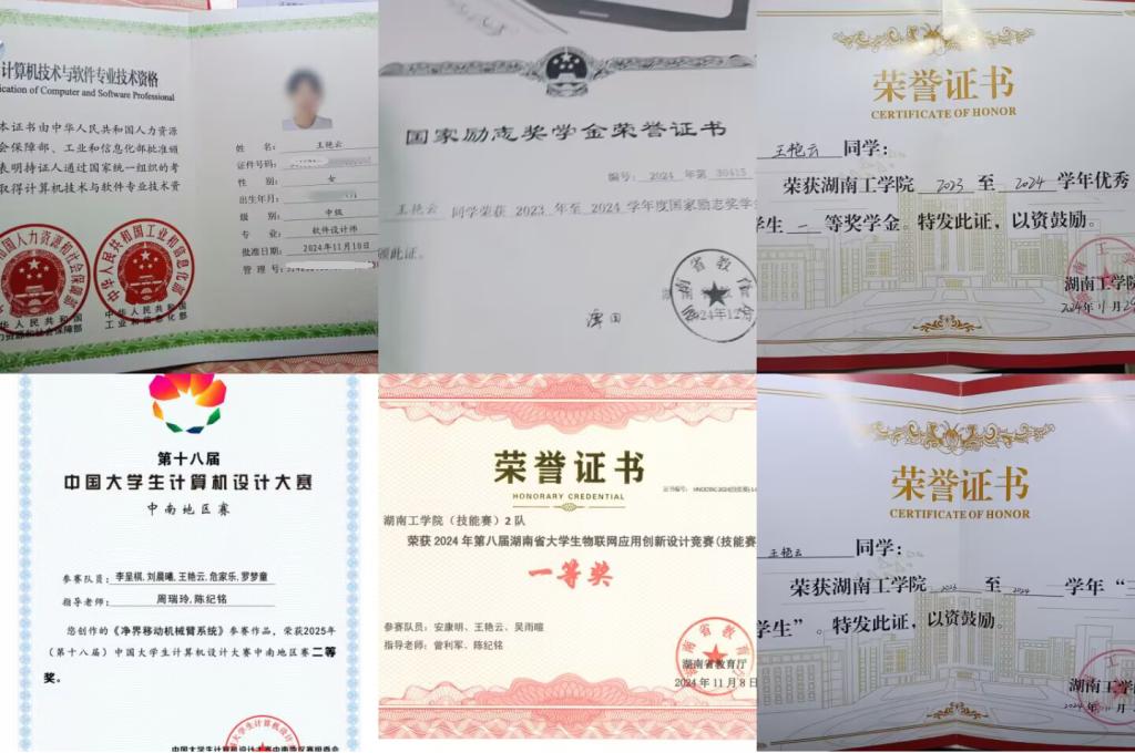 王艳云,女,汉族,中共预备党员,计算机科学与工程学院2022级计算机科学与技术专业学生。在校期间荣获国家励志奖学金3次、校级特等奖学金1次、校级一等奖学金2次,并两次获评“校级三好学生”。她已通过大学英语四、六级考试,并取得软件设计师证书。在学科竞赛方面,曾获第八届湖南省大学生物联网应用创新设计竞赛一等奖、第十八届中国大学生计算机设计大赛中南赛区二等奖。