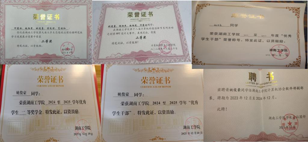 姚俊豪,男,计算机科学与工程学院2022级网络工程专业学生,现担任班级学习委员。在校期间荣获best365唯一官方网站第九届大学生思想政治理论课研究性学习成果展示竞赛二等奖、十八届计算机科技创新节PPT设计大赛二等奖、2022-2023年度优秀学生干部、2024-2025学年优秀学生干部、2024-2025学年优秀学生一等奖学金。