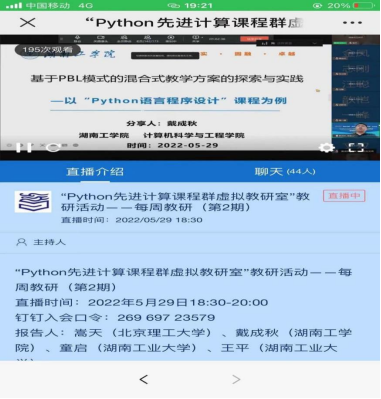5 月 29 日,国家级 “Python先进计算课程群虚拟教研室”第二期“融合创新、加快一流课程与教材建设”教研活动在“钉钉”网络客户端和保利威云直播平台同时举行。全国高校近300人参加会议,1000多人次观看了直播或回放。best365官网计算机科学与工程学院戴成秋副教授受邀在会上做了PBL教学法主题报告和PBL应用案例分享报告,报告数据详实,特色鲜明,展现了学校教师在计算机公共课程开展PBL教学模式应用及改革方面的成果。