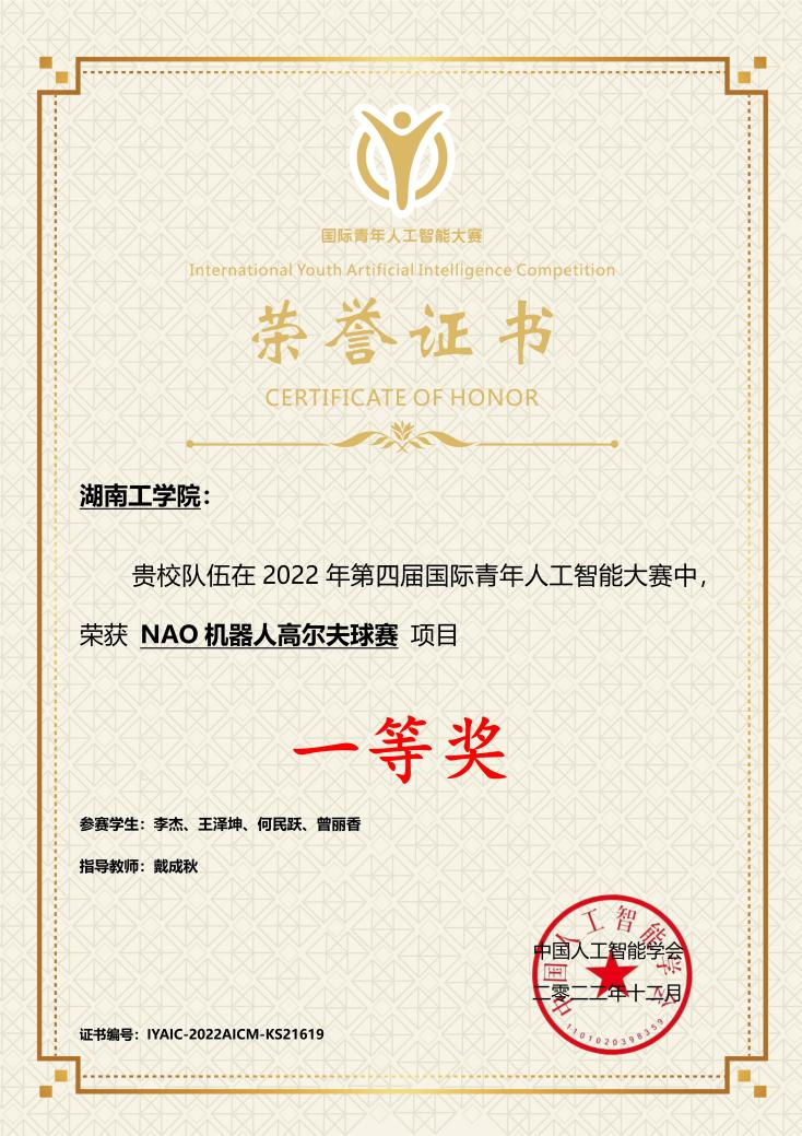 近日,计算机科学与工程学院学科竞赛迎来喜讯,best365官网李杰、王泽坤、何民跃、曾丽香四位学子组成的湖工高尔夫队参加由中国人工智能学会主办的2022年国际青年人工智能大赛,经过激烈竞争在赛项“NAO机器人高尔夫球赛”中脱颖而出,荣获一等奖。