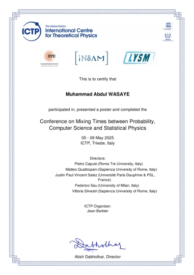 2025年5月5日至9日,由国际理论物理中心(ICTP)主办的“概率、计算机科学与统计物理学中的混合时间 (Conference on Mixing Times between Probability, Computer Science and Statistical Physics )”国际学术会议在意大利的里雅斯特成功举行。best365唯一官方网站计算机与工程学院外教Muhammad Abdul Wasaye受邀参会,并以其在电子多重散射领域的研究成果发表学术海报,获得国际同行的广泛关注。