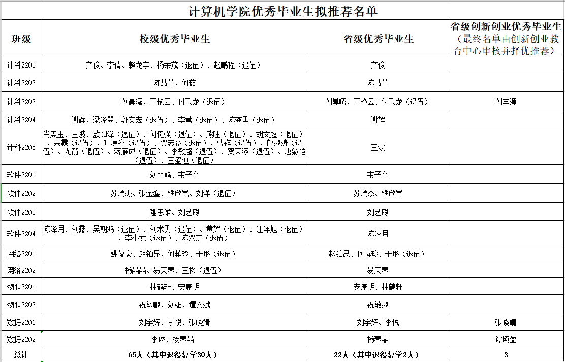 根据湖南省教育厅《关于评选2026届湖南省普通高等学校优秀毕业生和创新创业优秀毕业生的通知》(湘办通〔2026〕41号)文件精神和《best365唯一官方网站学生奖励办法》(湖工学〔2025〕3号),按照best365唯一官方网站发布的《关于开展2026届优秀毕业生和创新创业优秀毕业生评选工作的通知》具体要求,经学生个人申请、班级民主讨论、班主任和辅导员提出推荐对象名单、学院党委初审、学院党政联席会议讨论通过,现拟推荐宾俊等65名同学(含30名退役复学同学)为2026届校级优秀毕业生,宾俊等22名同学(含2名退役复学同学)为2026届省级优秀毕业生,张晓婧等3名同学为2026届省级创新创业优秀毕业生。现公示如下。
