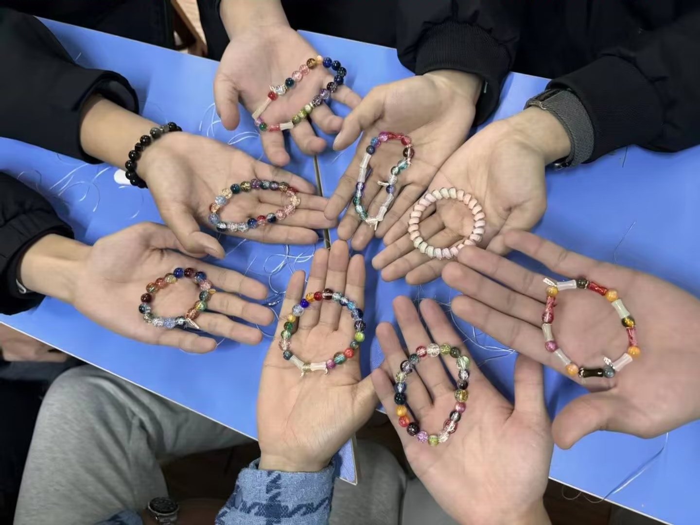 活动以手链编织为载体,引导同学们将内心情绪与美好期许融入手工创作,让抽象情感在一绳一珠间得以具象表达。活动现场,大家围坐相伴,巧用彩绳、串珠等材料,充分发挥创意巧思,编织出款式多样、独具心意的手链。在专注编织的过程中,同学们舒缓焦虑、放松身心,在交流互助中增进情谊、收获同伴支持,沉浸式感受手作带来的宁静与治愈。