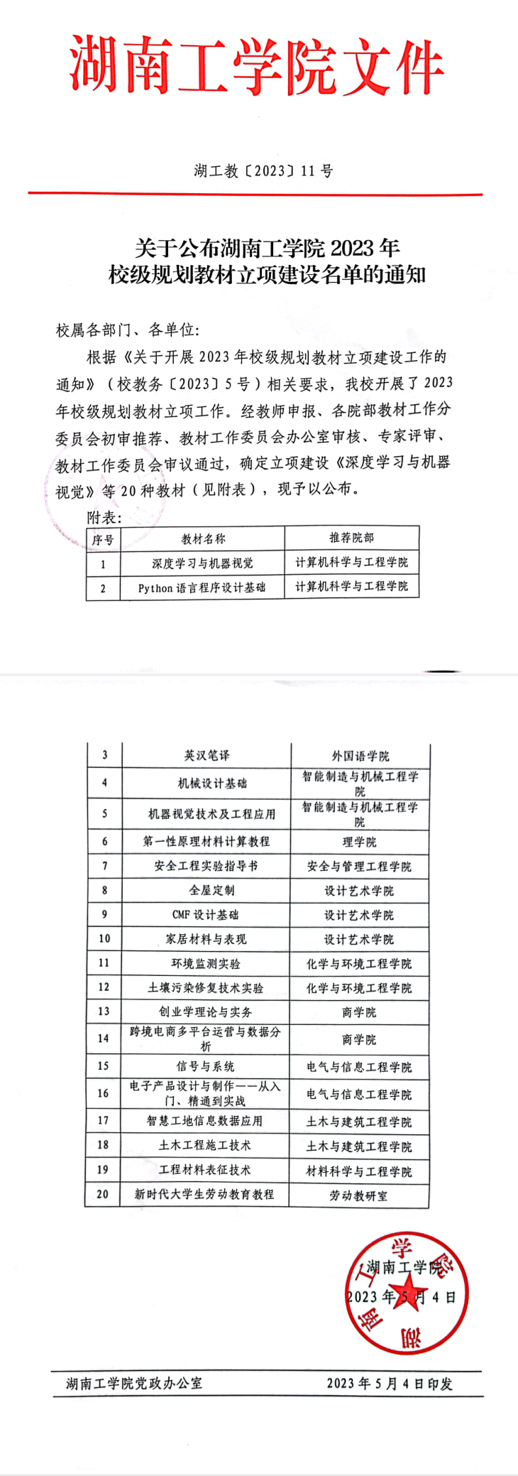 湖工教〔2023〕11号 关于公布best365唯一官方网站2023年校级规划教材立项建设名单的通知