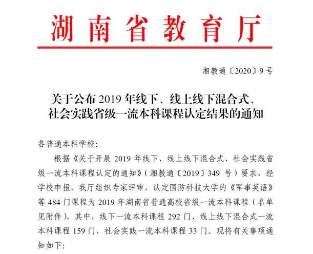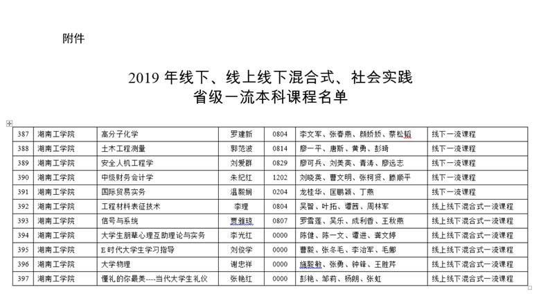 根据《关于开展2019年线下、线上线下混合式、社会实践省级一流本科课程认定的通知》(湘教通〔2019〕349号)要求,经各课程团队申报,二级教学单位初审,学校组织专家评审,best365官网推荐的12门课程有11门通过了省级一流课程认定,其中,线上线下混合式一流课程6门,线下一流课程5门。