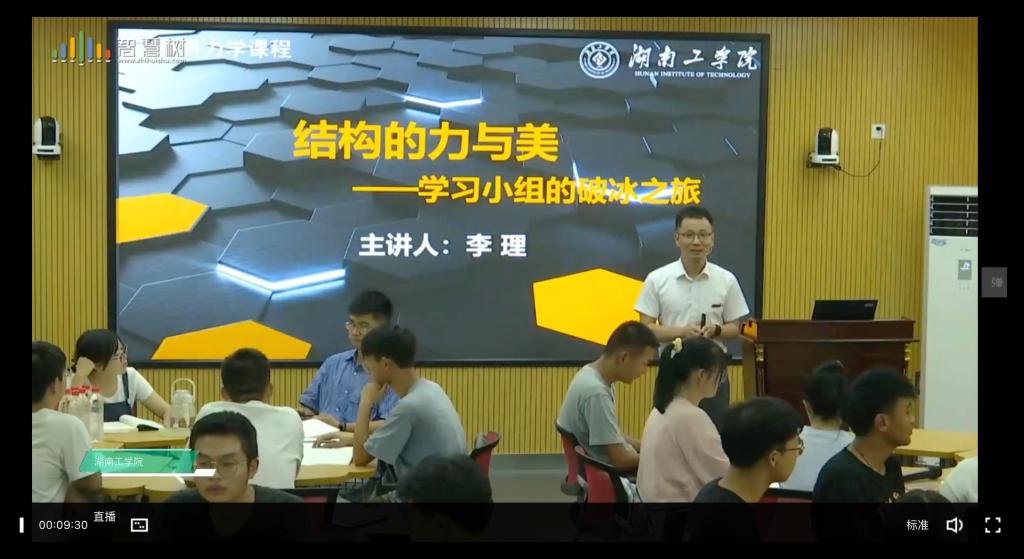 本次课的主题为《结构的力与美——学习小组的破冰之旅》,李理首先进行课程导学,介绍混合式教学的学习模式,鼓励同学们自主学习、合作学习及碎片化学习。其次,李理介绍了材料力学课程的定位与目标、学习内容、学习路径、能力目标、教学团队等,突出了本课程的重要性。最后一个环节是“分组搭建扑克牌承重结构”的小游戏,借此让学生了解结构的力与美的融合。