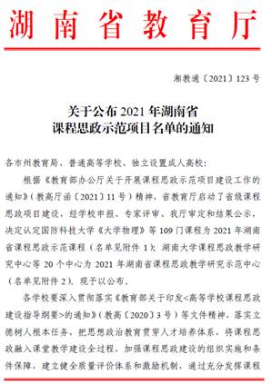 日前,湖南省教育厅下发了《关于公布2021年湖南省课程思政示范项目名单的通知》(湘教通〔2021〕123号),best365官网何建雄教授主持的《会计学》和张一夫副教授主持的《流体力学》两门课程成功立项。
