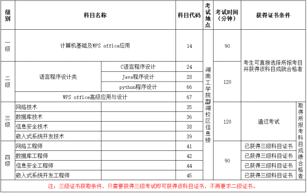 1.一级、二级、三级考试合格即可获得证书,四级获证条件必须已经或同时获得三级相关证书。自2022年起,教育部考试中心推出NCRE电子证书,所有符合取证条件的考生都将获得电子证书。2022年为试点期,考生在报名时可同时申请纸质证书。 2.2022年暂停三级Linux应用与开发技术、四级Linux应用与开发工程师两科目考试。2021年下半年已通过四级Linux考试的,成绩保留至2023年3月。2022年考试大纲及教程见中国教育考试网。从2022年9月考试起,新增二级openGauss数据库程序设计(科目代码68)。具体报考科目如下: