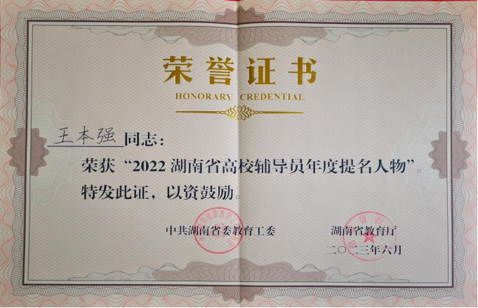 6月14日,“2022湖南省高校辅导员年度人物”评选结果揭晓,我院王本强荣获“2022湖南省辅导员年度提名人物”。