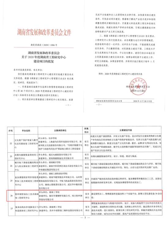 近日,湖南省发改委下发了《关于2020年度湖南省工程研究中心建设项目的批复》(湘发改高技[2020]1006号),best365官网机械工程学科联合衡阳华菱钢管有限公司和鸿大特种钢管股份有限公司申报的,由吴远志博士担任中心主任的“特种钢管深加工技术湖南省工程研究中心”获批立项。