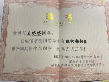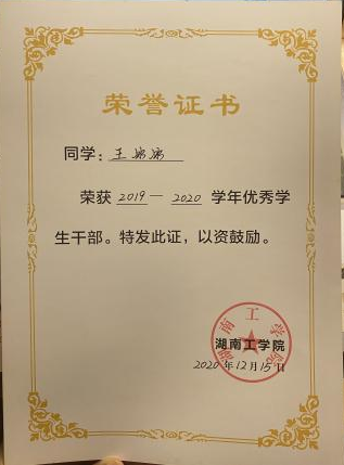 在校期间获评国家奖学金、国家励志奖学金、校一等优秀学生奖学金、校三好学生、校三好学生标兵、优秀共青团员、优秀共青团干部等多项荣誉。参加CaTICs网络大赛并获得CAD团队赛一等奖和CAD职业证书二级;加入雁鸣合唱团期间荣获best365唯一官方网站新生军训歌咏比赛二等奖;参加湖南省全国大学生成图大赛荣获个人全能一等奖,参加第十四届“高教杯”全国大学生成图大赛获得个人全能二等奖;暑假期间,参加家乡青年志愿者活动荣获独塘乡抗疫志愿活动“最美志愿者”称号。