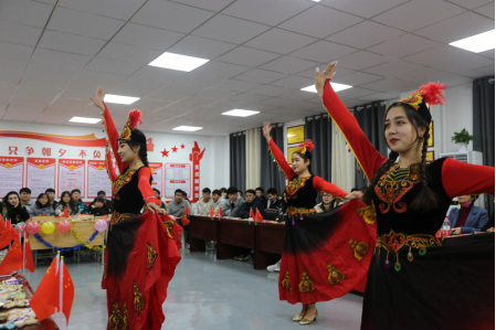 “五十六个民族,五十六支花,五十六个兄弟姐妹是一家”随着开场歌《爱我中华》的播放,现场热火朝天,每位同学都开始和身边的少数民族同学交流。几位身着民族服饰的女生来到教室中间跳起了维吾尔族舞蹈,赢得师生热烈地掌声,座谈会现场的气氛瞬间达到一个小高潮。