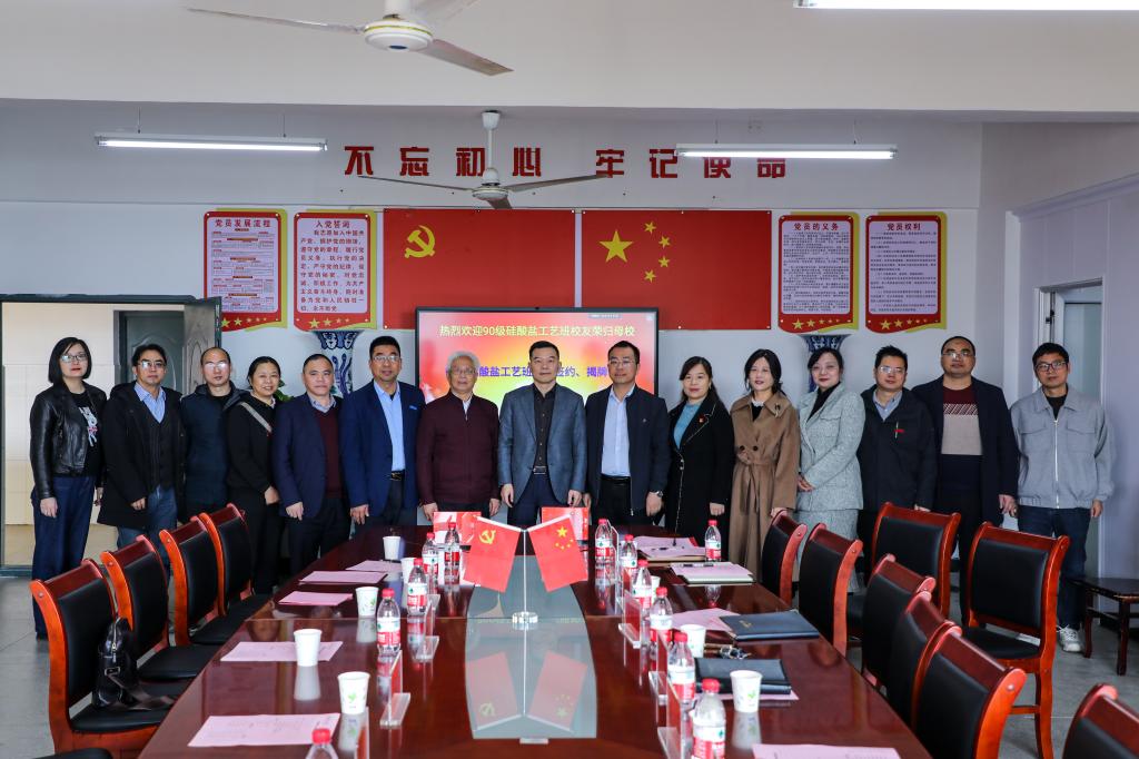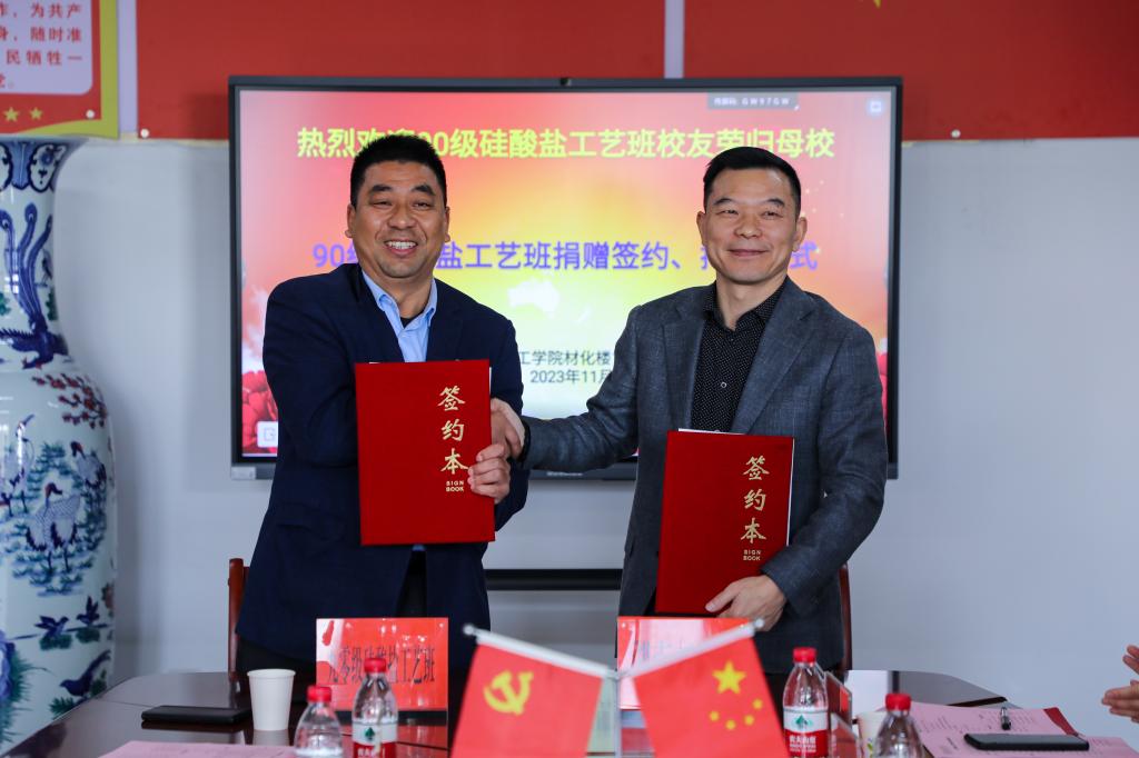 双方在仪式上签订了捐赠协议。 与会人员共同为90级硅酸盐工艺班认捐树举行揭牌仪式,并合影留恋。