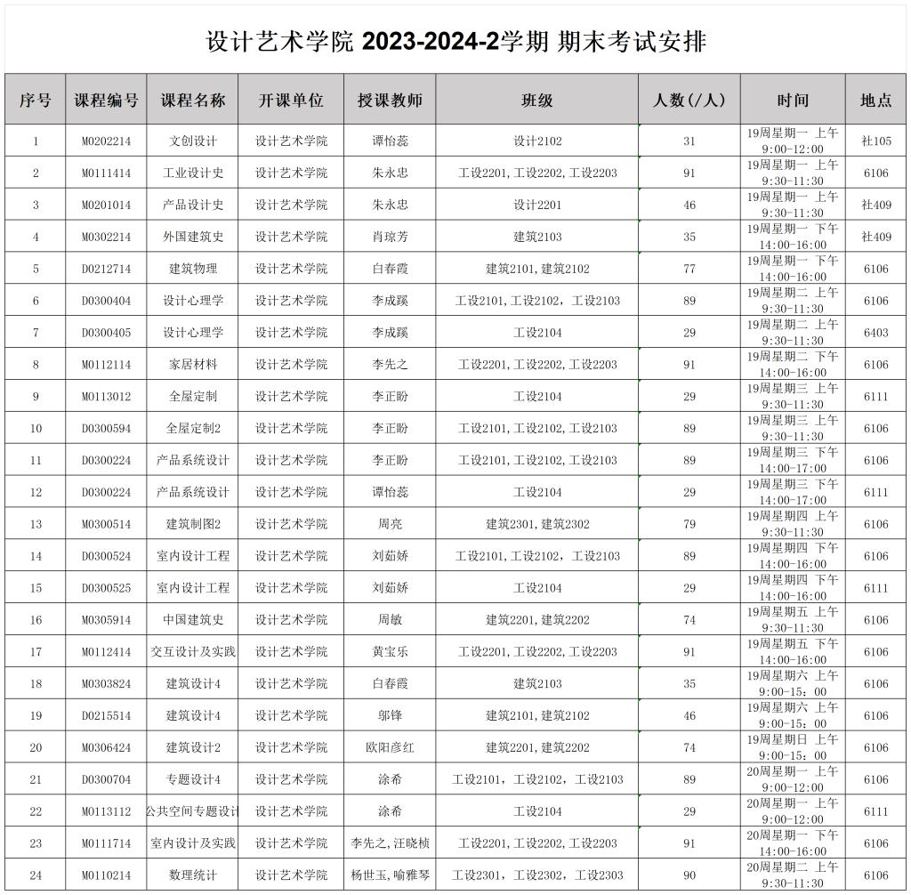 设计艺术学院 2023-2024-2学期 期末考试安排
