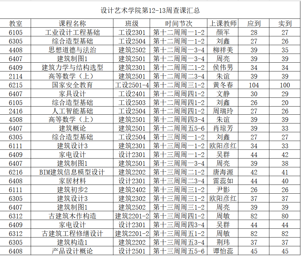 根据学院第12-13周课堂考勤数据统计,现将到课情况通报如下: