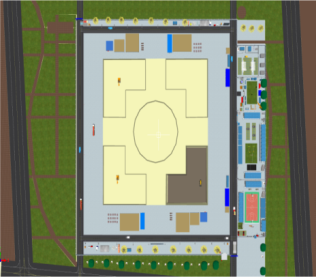 (6)施工现场布置难点:钢构屋面拼装平台和提升平台塔吊的选取,覆盖面广,钢构重量大,通过计算后选取型号及位置。减少二次搬运,合理布置堆场和仓库。