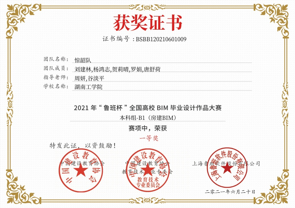 (1)“第三届全国中高等院校BIM电子招投标大赛”B1模块全国一等奖。