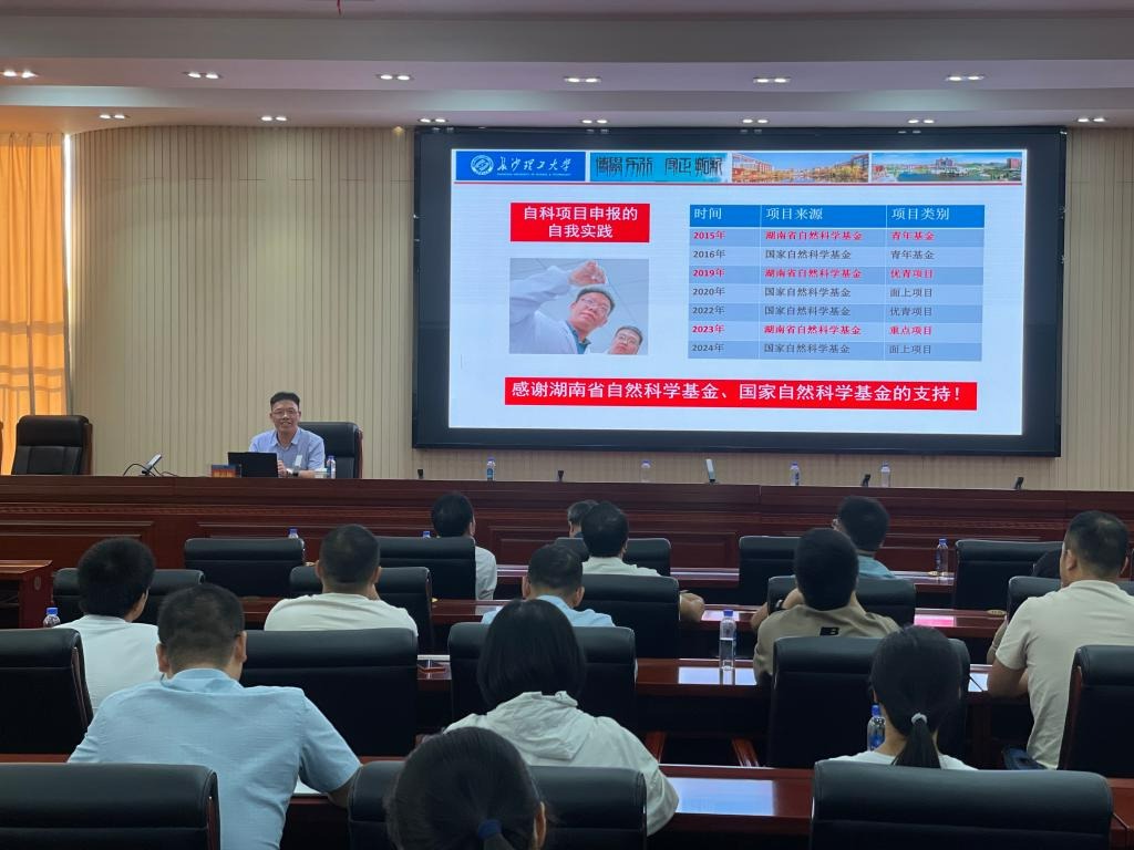 9月24日下午,best365官网在教学大楼12楼船山报告厅举办自然科学基金项目申报专题报告会,湖南省自然科学基金委员会办公室主任杨剑、长沙理工大学化学化工学院教授卿志和应邀作专题报告。科技与校企合作处、学科建设与发展规划处主要负责人、自科类学院分管科研副院长、具有博士学位或副高职称以上教师150余人参加了报告会。报告会分上下两场,上半场由校长曾广胜主持,下半场由党委副书记何建雄主持。