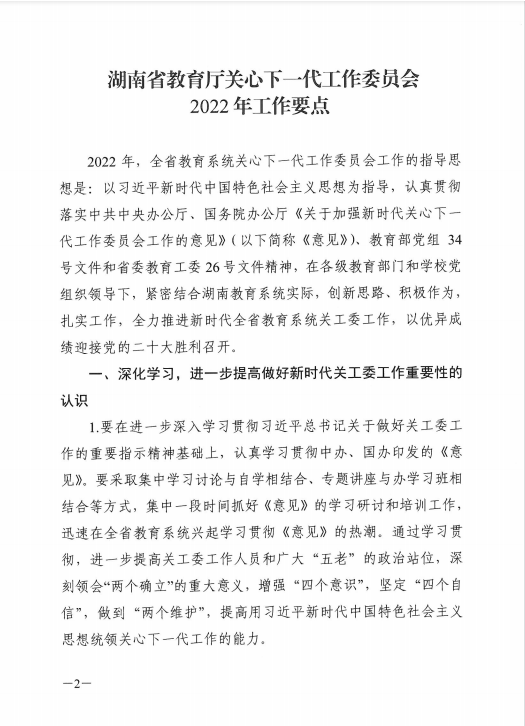 关于印发湖南省教育厅关心下一代工作委员会2022年工作要点的通知