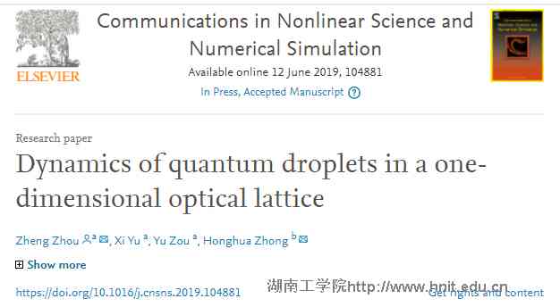 2015级材料物理专业本科生喻习、邹禹作为第二、第三作者在中科院SCI分区应用数学一区TOP期刊《Communications in Nonlinear Science Numerical Simulation》上在线发表题为“Dynamics of quantum lets in a one-dimensional optical lattice”的高水平学术论文(指导老师周政为论文的第一作者)。喻习和邹禹同学成绩优异,对物理学与数学有浓厚的兴趣,现已分别考取广西大学和湘潭大学硕士研究生。