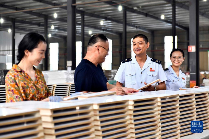 2021年6月16日,在菏泽金然木制品有限公司,山东省菏泽市曹县税务局的工作人员上门走访,介绍出口退税相关优惠政策。新华社记者 郭绪雷 摄