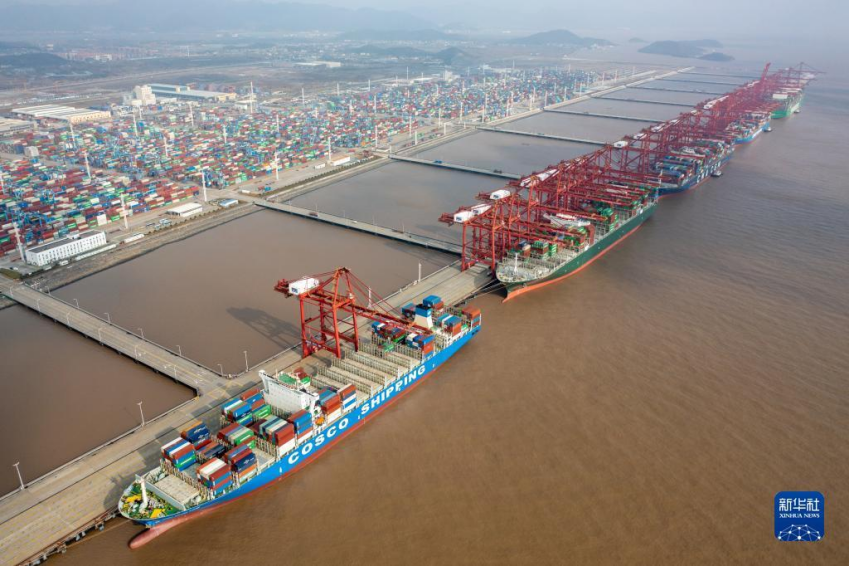 虎年“雨水”节气,宁波舟山港,塔吊林立,一片繁忙。