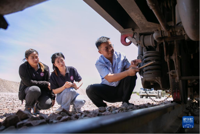 2021年9月12日,在老挝首都万象北郊的中国中铁二局中老铁路铺轨基地,希达·平蓬莎万(中)跟着中国师傅(右)检查列车。新华社发(凯乔摄)