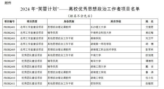 近日,根据湖南省教育厅发布的《关于公布2024年“芙蓉计划”——高校优秀思想政治工作者项目名单的通知》(湘教工委通〔2024〕20号),我院副院长伍小乐教授获得高校优秀思想政治工作者项目中的优秀团队建设项目立项。