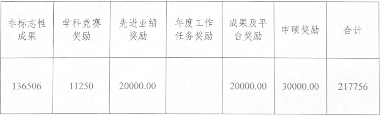 1.非标志性成果奖励(136506元)按照个人教学积分(2040分)和科研积分(2510.2分)全额发放给个人。