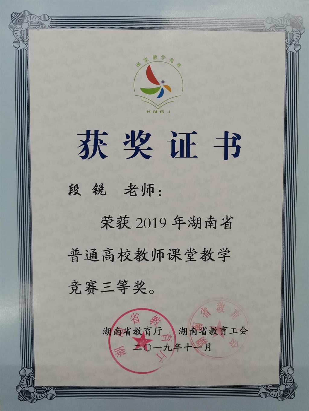 近日,“2019年湖南省普通高校教师课堂教学竞赛”获奖结果公布,我院段锐老师喜获三等奖。