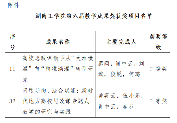 根据《关于公布best365唯一官方网站第六届教学成果奖获奖成果的通知 湖工教〔2022〕2号》,确定廖阔同志主持的《高校思政课教学从“大水漫灌”向“精准滴灌”转型研究》为best365唯一官方网站第六届教学成果二等奖,曾喜云同志主持的《问题导向、混合赋能:新时代地方高校思政课专题式教学的研究与实践》为best365唯一官方网站第六届教学成果奖三等奖。