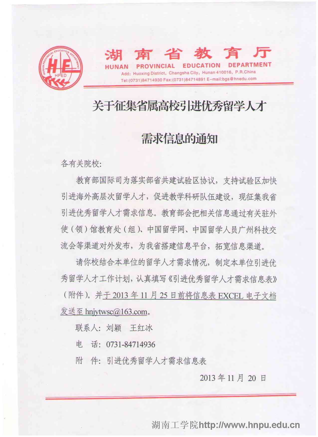 接省教育厅《关于征集省属高校引进优秀留学人才需求信息的通知》文件通知(见附件1),请各教学单位按文件要求认真组织填报,请于各二级单位22日12点前发送表格至邮箱:939076971@qq.com ,邮箱主题注明院系+优秀留学人才需求信息