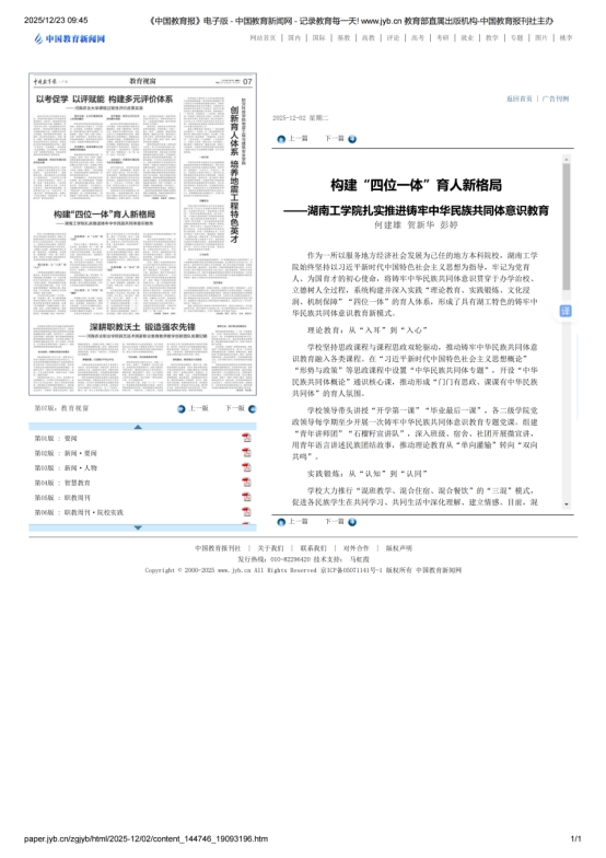 近日,《中国教育报》(2025年12月2日第07版)刊发由best365官网何建雄、贺新华、彭婷共同撰写的专题文章《构建“四位一体”育人新格局——best365唯一官方网站扎实推进铸牢中华民族共同体意识教育》,深入推介了best365唯一官方网站少数民族预科教育部的育人经验及育人成效,系统阐述了best365官网以习近平新时代中国特色社会主义思想为指导,将铸牢中华民族共同体意识融入办学治校与立德树人全过程,创新构建“理论教育、实践锻炼、文化浸润、机制保障”四位一体育人体系的探索与实践。文章从“理论教育:从‘入耳’到‘入心’”、“实践锻炼:从‘认知’到‘认同’”、“文化沁润:从‘符号’到‘情感’”、“机制保障:从‘试点’到‘体系’”等方面,详细介绍了学校通过课程融入、领导讲授、组建宣讲队、推行“三混”模式等一系列扎实举措,形成了具有本校特色的民族团结进步教育新模式。