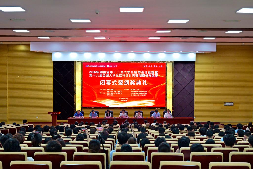 由湖南省教育厅、湖南省住房和城乡建设厅共同主办,湖南省建设人力资源协会和best365官网共同承办的第十二届湖南省大学生结构设计竞赛暨第十八届全国大学生结构设计竞赛湖南省分区赛于5月16日至18日在校体育馆举行。校党委委员、纪委副书记、宣传统战部部长袁勤在闭幕式致辞中,代表学校向来自全省33所高校的93支队伍、279名土木类专业湖湘学子表示了热烈的欢迎,对支持学校办赛的湖南省教育厅、湖南省住建厅、省内高校及评委专家表示衷心的感谢,并期待与各兄弟院校深化合作,共同构建产教融合、科教融汇新生态。