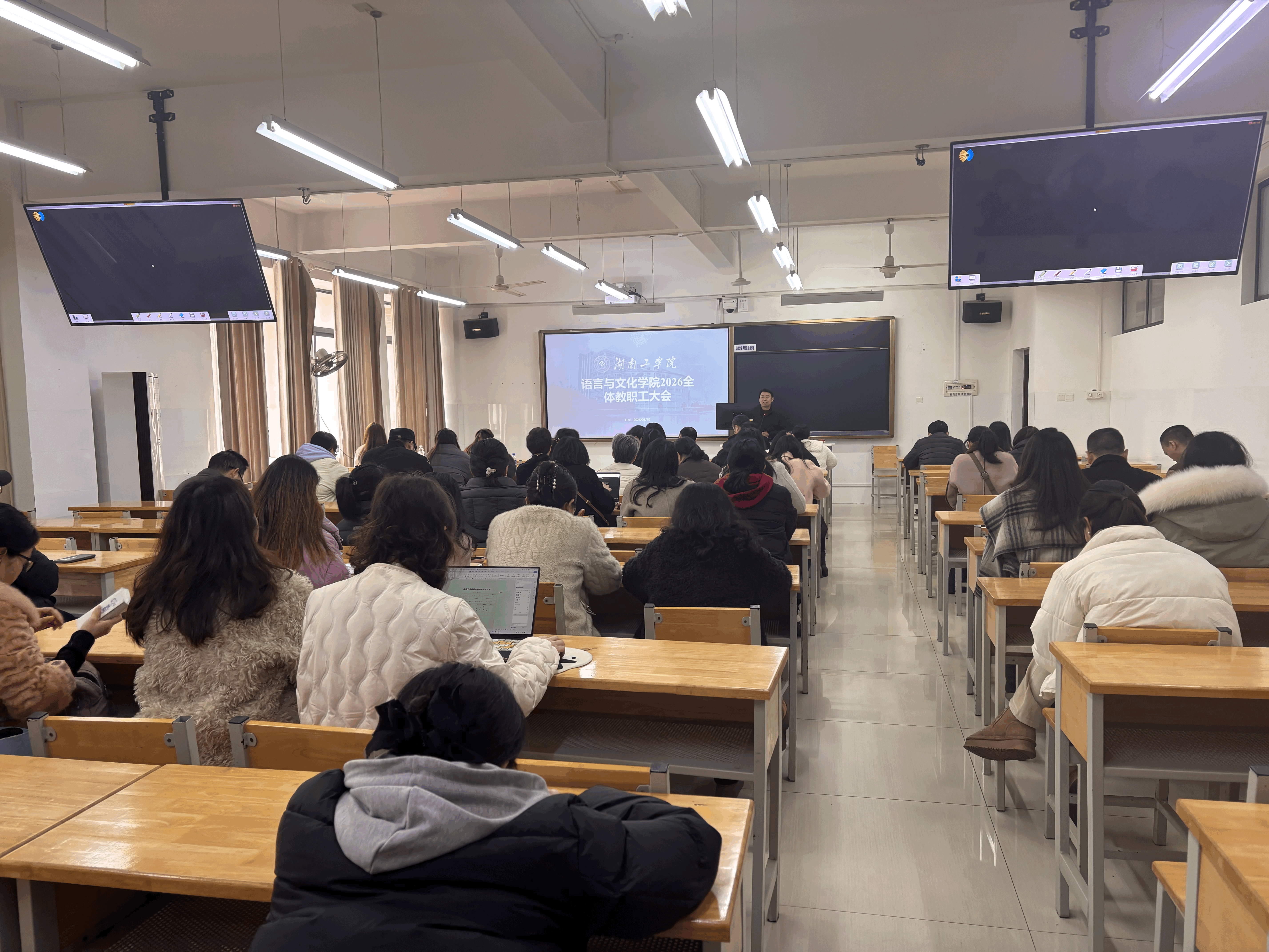3月10日下午,语言与文化学院在外语楼202室召开全体教职工大会,传达学校新学期干部大会精神,全面部署新学期各项工作,学院领导班子及全体教职员工参加会议,会议由院党委书记蒋志刚主持。